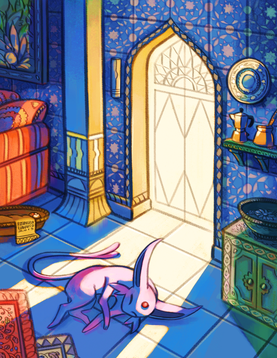 Art print - Espeon in the sunbeam, originally featured in "Eeveeluzine". Print is 21.5cm x 27cm (8.4'' x 10.6''). Printed on 100lb matte cover cardstock. Each print is signed on the back.