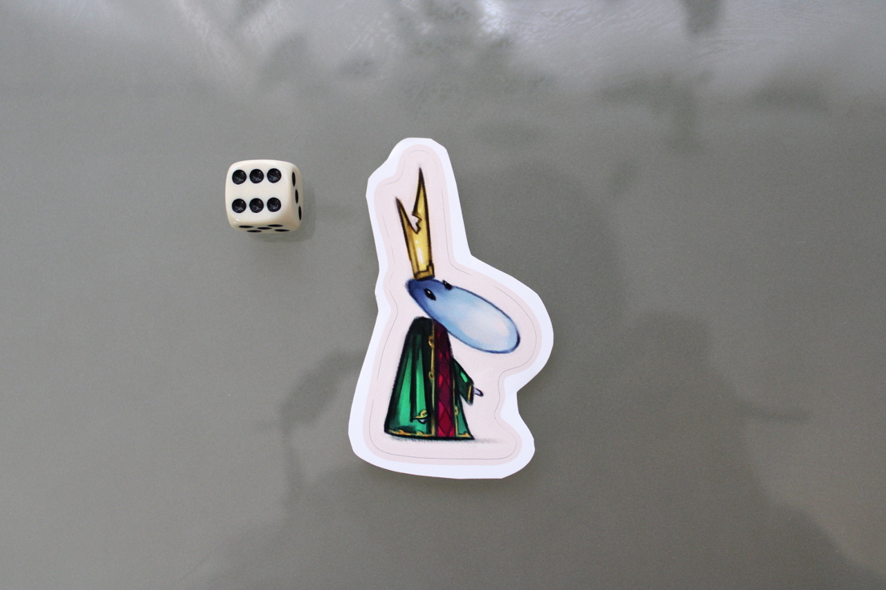 Teensie King sticker. Sticker area: 3.5 cm x 7 cm (1.3'' x 2.7''). Sticker is made of vinyl. It's waterproof! Microwave and dishwasher safe.