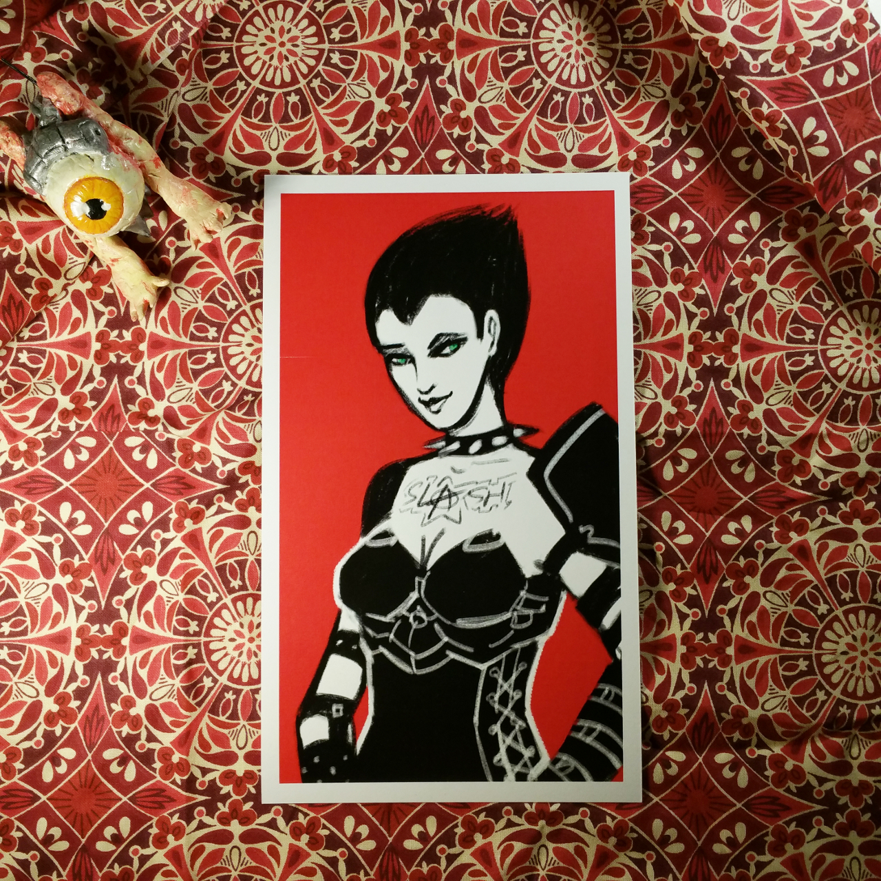 Art print - Slash from Quake III Arena. This is a small print, 12.7cm x 21.5cm (5'' x 8.4''). Printed on 100lb matte cover cardstock. Each print is signed on the back.