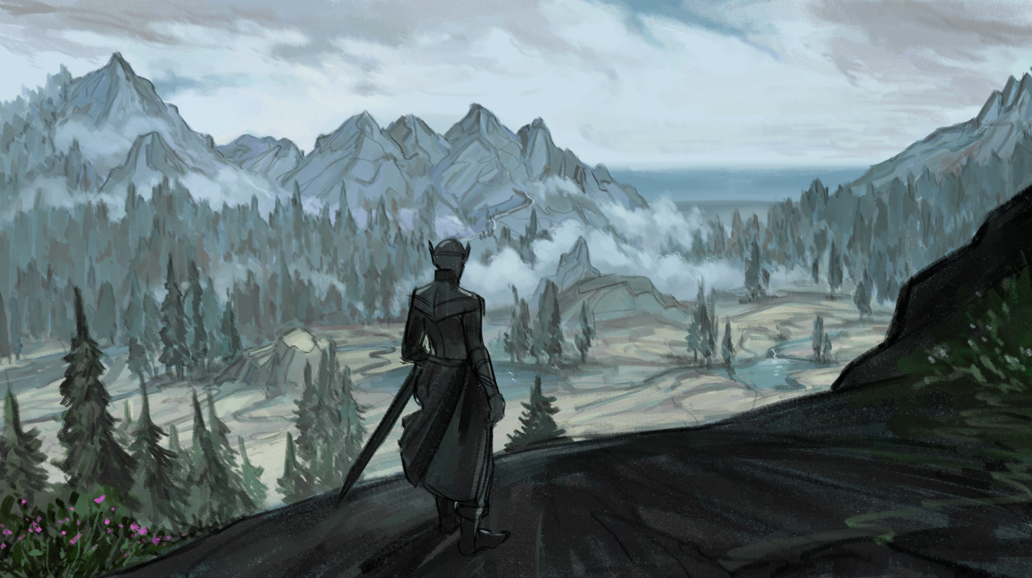 Art print - Landscape from Skyrim. Print is 29.5cm x 17cm (11.6'' x 6.7''). Printed on 100lb matte cover cardstock. Each print is signed on the back.