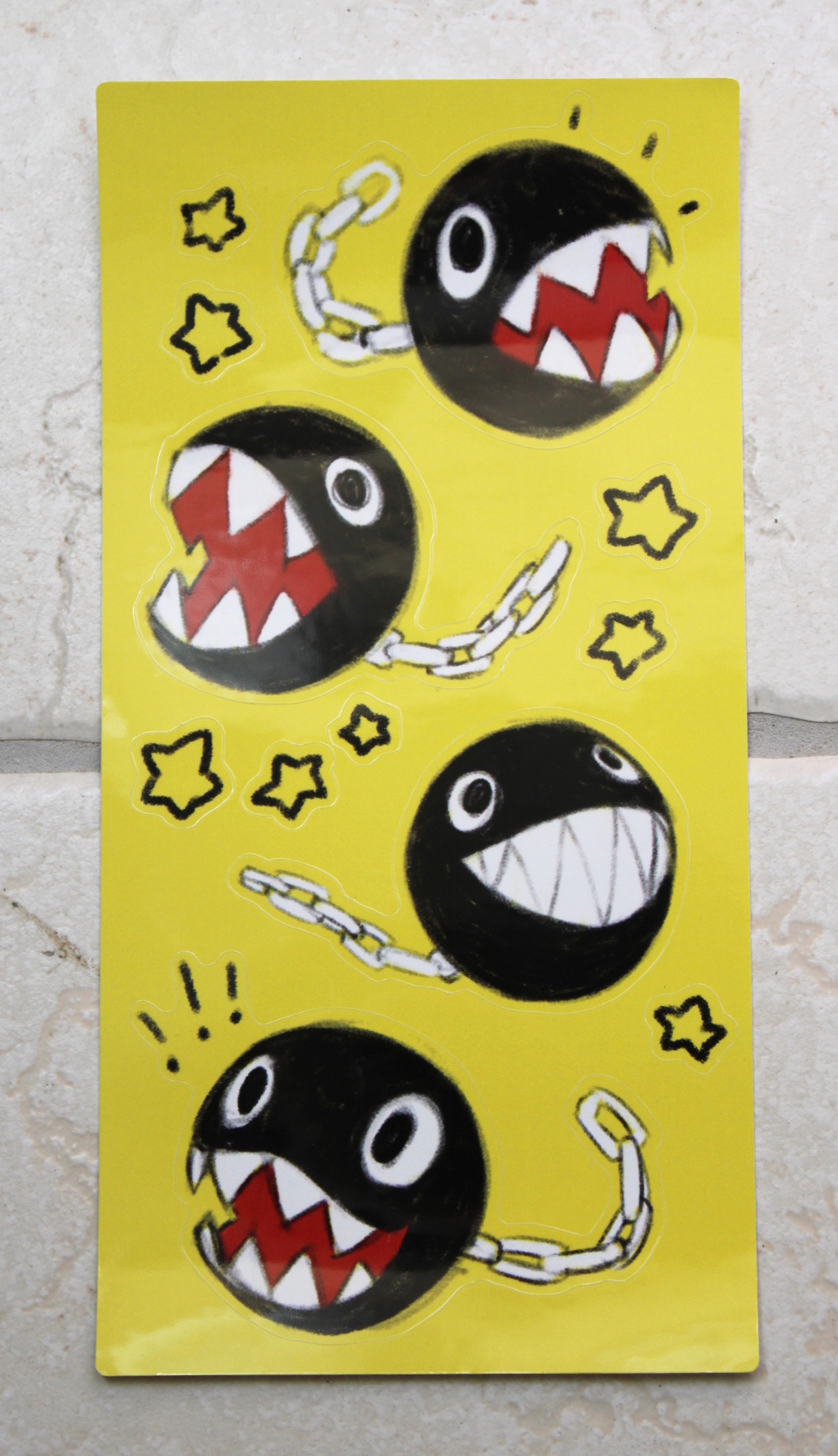 Chain Chomp sticker sheet, including 4 delightful Chain Chomps plus 8 stars. Sticker sheet size: 10 cm x 20 cm (3.9'' x 7.8''). Stickers are made of vinyl. It's waterproof!